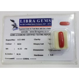 REPORT NO . LCI 237CLARITY . N/ACOLOUR . REDSHAPE / CUT . CAPSULEWT . 3.86 CTSDIMENSION . 5-4.5-6.5-3.R . INDEX . N/AHARDNESS . 3.5COMMENT . CORAL..