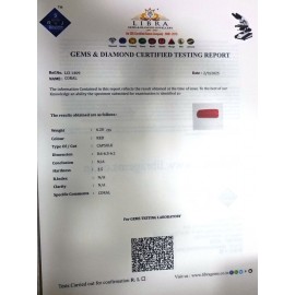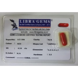 REPORT NO . LCI 306CLARITY . N/ACOLOUR . REDSHAPE / CUT . CAPSULEWT . 4.54 CTSDIMENSION . 5-3.5-3.5-7.R . INDEX . N/AHARDNESS . 3.5COMMENT . CORAL..