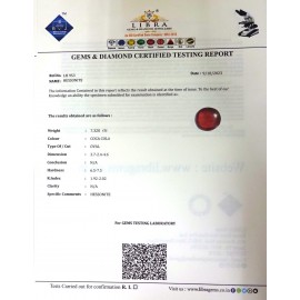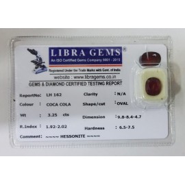 REPORT NO . LH 162CLARITY . N/ACOLOUR . COCA COLASHAPE / CUT . OVALWT . 3.25 CTSDIMENSION . 9-8.8-4.4-7.R . INDEX . 1.92-2.02HARDNESS . 6.5-7.5COMMENT . HESSONITE..