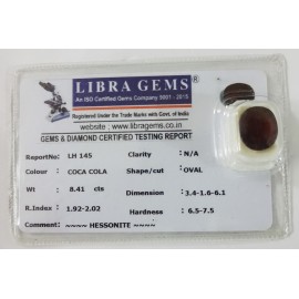 REPORT NO . LH 145CLARITY . N/ACOLOUR . COCA COLASHAPE / CUT . OVALWT . 8.41 CTSDIMENSION . 3-4.1-6.6-1.R . INDEX . 1.92-2.02HARDNESS . 6.5-7.5COMMENT . HESSONITE..