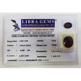 REPORT.NO.LHS 244CLARITY.N/ACOLOUR.COCA COLASHAPE/CUT.OVALWT.6.00 CTSDIMENSION.3.1-1.1-5.1R.INDEX.1.92-2.02HARDNESS.6.5-7.5COMMENT.HESSONITE {S}..