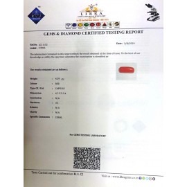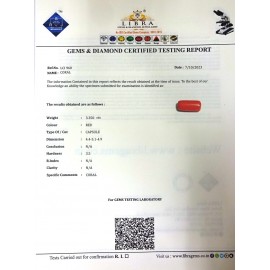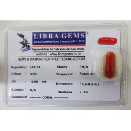 REPORT NO . LCI 31CLARITY . N/ACOLOUR . REDSHAPE / CUT . CAPSULEWT . 4.06 CTSDIMENSION . 5-6.8-2.4-1.R . INDEX . N/AHARDNESS . 3.5COMMENT . CORAL..