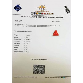 REPORT NO . LCI 268CLARITY . N/ACOLOUR . REDSHAPE / CUT . TRIANGLEWT . 4.69 CTSDIMENSION . 3-6.2-7.4-3.R . INDEX . N/AHARDNESS . 3.5COMMENT . CORAL..