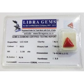 REPORT.NO.LCI 424CLARITY.N/ACOLOUR.REDSHAPE/CUT.TRIANGLEWT.3.38 CTSDIMENSION.9.9-10.5-5.6R.INDEX.N/AHARDNESS.3.5COMMENT.CORAL..