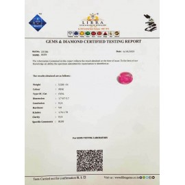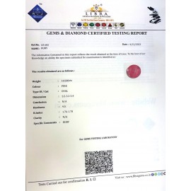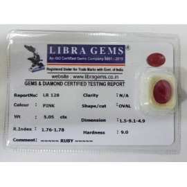 REPORT NO . LR 128CLARITY . N/ACOLOUR . PINKSHAPE / CUT . OVALWT . 5.05 CTSDIMENSION . 1-5.9-1.4-9.R . INDEX . 1.76-1.78HARDNESS . 9.0COMMENT . RUBY..