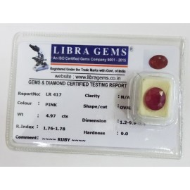 REPORT.NO.-LR 417CLARITY.-N/ACOLOUR.-PINKSHAPE/CUT.-OVALWT.-4.97 CTSDIMENSION.-1-2.9-9.4-4.R.INDEX.-1.76-1.78HARDNESS.-9.0COMMENT.-RUBY..