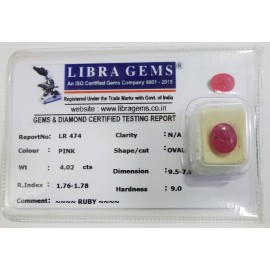 REPORT.NO.-LR 474CLARITY.-N/ACOLOUR.-PINKSHAPE/CUT.-OVALWT.-4.02 CTSDIMENSION.-9-5.7-9.5-3.R.INDEX.-1.76-1.78HARDNESS.-9.0COMMENT.-RUBY..