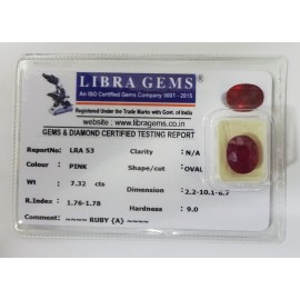REPORT NO . LRA 53CLARITY . N/ACOLOUR . PINKSHAPE / CUT . OVALWT . 7.32 CTSDIMENSION . 2-2.10-1.6-7.R . INDEX . 1.76-1.78HARDNESS . 9.0COMMENT . RUBY { A }..