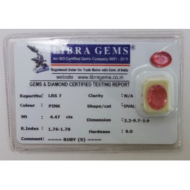 REPORT NO . LRS 7CLARITY . N/ACOLOUR . PINKSHAPE / CUT . OVALWT . 4.47 CTSDIMENSION . 2-2.9-7.3-9.R . INDEX . 1.76-1.78HARDNESS . 9.0COMMENT . RUBY { S }..