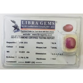 REPORT.NO.-LRA 151CLARITY.-N/ACOLOUR.-PINKSHAPE/CUT.-OVALWT.-13.93 CTSDIMENSION.-3-3.1-8.8-3.R.INDEX.-1.76-1.78HARDNESS.-9.0COMMENT.-RUBY { A }..