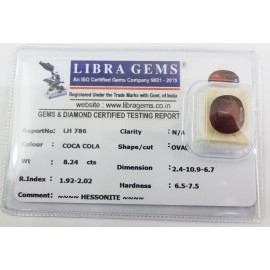 REPORT NO . LH 8CLARITY . N/ACOLOUR . COCA COLASHAPE / CUT . OVALWT . 6.96 CTSDIMENSION . 2-5.10-6.5-2.R . INDEX . 1.92-2.02HARDNESS . 6.5-7.5COMMENT . HESSONITE..