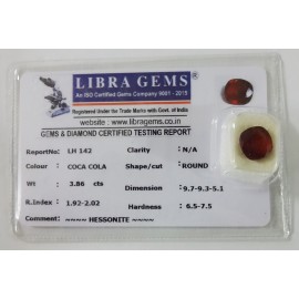 REPORT NO . LH 142CLARITY . N/ACOLOUR . COCA COLASHAPE / CUT . ROUNDWT . 3.86 CTSDIMENSION . 9-7.9-3.5-1.R . INDEX . 1.92-2.02HARDNESS . 6.5-7.5COMMENT . HESSONITE..