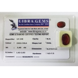 REPORT.NO.-LH 327CLARITY.-N/ACOLOUR.-COCA COLASHAPE/CUT.-OVALWT.-5.50 CTSDIMENSION.-2-5.10-1.5-1.R.INDEX.-1.92-2.02HARDNESS.-6.5-7.5COMMENT.-HESSONITE..