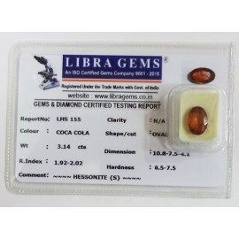 REPORT.NO.-LHS 155CLARITY.-N/ACOLOUR.-COCA COLASHAPE/CUT.-OVALWT.-3.14 CTSDIMENSION.-10-8.7-5.4-1.R.INDEX.-1.92-2.02HARDNESS.-6.5-7.5COMMENT.-HESSONITE { S }..