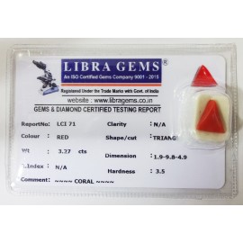 REPORT NO . LCI 71CLARITY . N/ACOLOUR . REDSHAPE / CUT . TRIANGLEWT . 3.27 CTSDIMENSION . 1-9.9-8.4-9.R . INDEX . N/AHARDNESS 3.5COMMENT . CORAL...