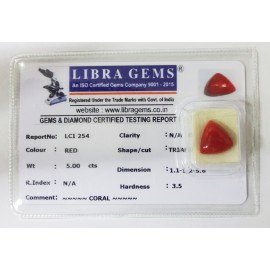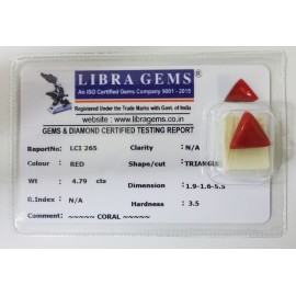REPORT NO . LCI 254CLARITY . N/ACOLOUR . REDSHAPE / CUT . TRIANGLEWT . 5.00 CTSDIMENSION . 1-1.1-2.5-6.R . INDEX . N/AHARDNESS . 3.5COMMENT . CORAL..