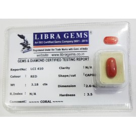 REPORT.NO.LCI 410CLARITY.N/ACOLOUR.REDSHAPE/CUT.CAPSULEWT.3.18 CTSDIMENSION.2.6-6.2-4.6R.INDEX.N/AHARDNESS.3.5COMMENT.CORAL..