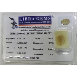 REPORT.NO.-LYS 111CLARITY.-N/ACOLOUR.-L. YELLOWSHAPE/CUT.-OVALWT.-4.13 CTSDIMENSION.-10-1.7-5.5-4.R.INDEX.-1.76-1.78HARDNESS.-9.0COMMENT.-YELLOW SAPPHIRE { S }..