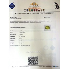 REPORT.NO.-LYA 122CLARITY.-N/ACOLOUR.-YELLOWSHAPE/CUT.-OVALWT.-3.67 CTSDIMENSION.-9-4.7-5.5-2.R.INDEX.-1.76-1.78HARDNESS.-9.0COMMENT.-YELLOW SAPPHIRE { A }..