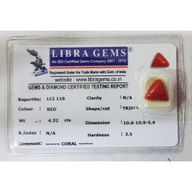 REPORT NO . LCI 118CLARITY . N/ACOLOUR . REDSHAPE / CUT . TRIANGLEWT . 4.32 CTSDIMENSION . 10-6.10-9.5-4.R . INDEX . N/AHARDNESS . 3.5COMMENT . CORAL..
