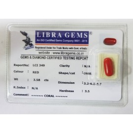REPORT NO . LCI 349CLARITY . N/ACOLOUR . REDSHAPE / CUT . OVALWT . 3.58 CTSDIMENSION . 3-2.6-2.4-7.R . INDEX . N/AHARDNESS . 3.5COMMENT . CORAL..