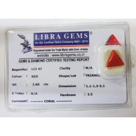 REPORT. NO. LCI 47CLARITY. N/ACOLOUR. REDSHAPE/CUT. TRIANGLEWT. 3.88 CTSDIMENSION. 1.1-1.3-5.1R. INDEX. N/AHARDNESS. 3.5COMMENT. CORAL..