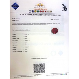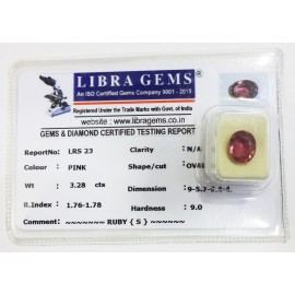 REPORT.NO.-LRS 23CLARITY.-N/ACOLOUR.-PINKSHAPE/CUT.-OVALWT.-3.28 CTSDIMENSION.-9-5.7-9.4-4.R.INDEX.-1.76-1.78HARDNESS.-9.0COMMENT.-RUBY { S }..