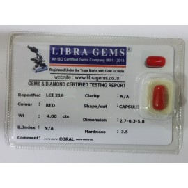 REPORT NO . LCI 216CLARITY . N/ACOLOUR . REDSHAPE / CUT . CAPSULEWT . 4.00 CTSDIMENSION . 2-7.6-3.5-8.R . INDEX . N/AHARDNESS . 3.5COMMENT . CORAL..