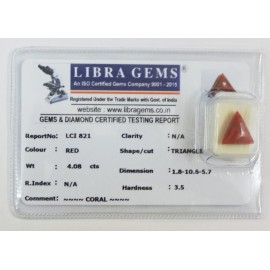 REPORT NO . LCI 110CLARITY . N/ACOLOUR . REDSHAPE / CUT . TRIANGLEWT . 3.90 CTSDIMENSION . 10-2.10-3.6-1.R . INDEX . N/AHARDNESS . 3.5COMMENT . CORAL..