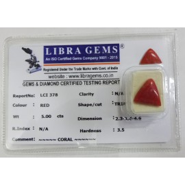 REPORT NO . LCI 378CLARITY . N/ACOLOUR . REDSHAPE / CUT . TRIANGLEWT . 5.00 CTSDIMENSION . 2-3.2-4.4-6.R . INDEX . N/AHARDNESS . 3.5COMMENT . CORAL..