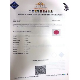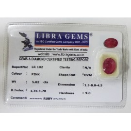 REPORT NO . LR 102CLARITY . N/ACOLOUR . PINKSHAPE / CUT . OVALWT . 5.02 CTSDIMENSION . 1-3.8-8.4-5.R . INDEX . 1.76-1.78HARDNESS . 9.0COMMENT . RUBY..