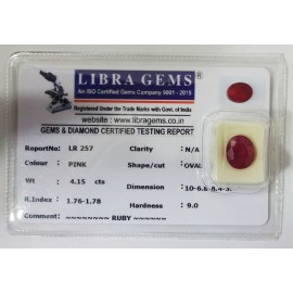 REPORT NO . LR 257CLARITY . N/ACOLOUR . PINKSHAPE / CUT . OVALWT . 4.15 CTSDIMENSION . 10-6.8-8.4-3.R . INDEX . 1.76-1.78HARDNESS . 9.0COMMENT . RUBY..
