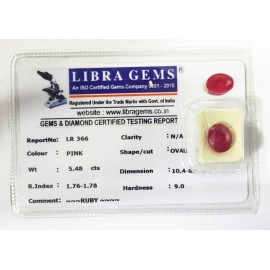 REPORT.NO.-LR 366CLARITY.-N/ACOLOUR.-PINKSHAPE/CUT.-OVALWT.-5.48 CTSDIMENSION.-10.4-8.5-6.1R.INDEX.-1.76-1.78HARDNESS.-9.0COMMENT.-RUBY..