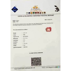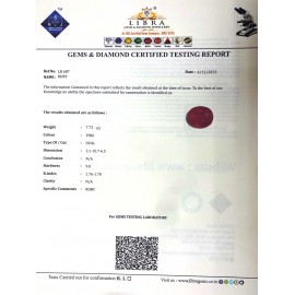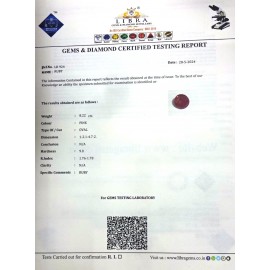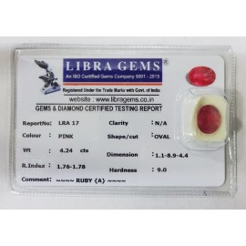 REPORT NO . LRA 17CLARITY . N/ACOLOUR . PINKSHAPE / CUT . OVALWT . 4.24 CTSDIMENSION . 1-1.8-9.4-4.R . INDEX . 1.76-1.78HARDNESS . 9.0COMMENT . RUBY { A }..