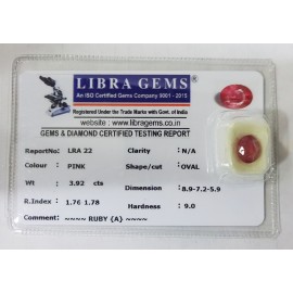 REPORT. NO. LRA 22CLARITY. N/ACOLOUR. PINKSHAPE/CUT. OVALWT. 3.92 CTSDIMENSION. 8.9-7.2-5.9R.INDEX. 1.76-1.78HARDNESS. 9.0COMMENT. RUBY {A}..