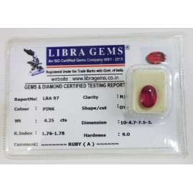 REPORT.NO.-LRA 97CLARITY.-N/ACOLOUR.-PINKSHAPE/CUT.-OVALWT.-4.25 CTSDIMENSION.-10-4.7-7.5-3.R.INDEX.-1.76-1.78HARDNESS.-9.0COMMENT.-RUBY { A }..