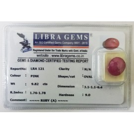 REPORT.NO.-LRA 121CLARITY.-N/ACOLOUR.-PINKSHAPE/CUT.-OVALWT.-9.82 CTSDIMENSION.-3-1.1-1.6-4.R.INDEX.-1.76-1.78HARDNESS.-9.0COMMENT.-RUBY { A }..