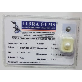 REPORT NO . LP 715CLARITY . N/ACOLOUR . SHINING WHITESHAPE / CUT . ROUNDWT . 3.67 CTSDIMENSION . 8-1.8-1.6-7.R . INDEX . N/AHARDNESS . 3.0COMMENT . PEARL..
