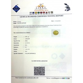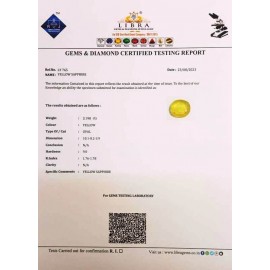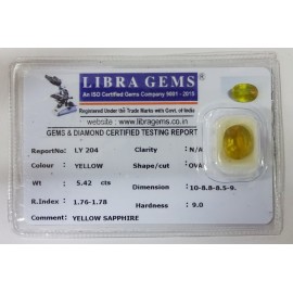 REPORT NO . LY 204CLARITY . N/ACOLOUR . YELLOWSHAPE / CUT . OVALWT . 5.42 CTSDIMENSION . 10-8.8-8.5-9.R . INDEX . 1.76-1.78HARDNESS . 9.0COMMENT . YELLOW SAPPHIRE..