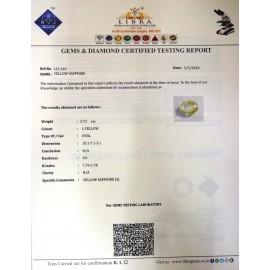 REPORT.NO.LY 501CLARITY.N/ACOLOUR.YELLOW SHAPE/CUT.OVALWT.5.11 CTSDIMENSION.2.1-9.8-4.6R.INDEX.1.76-1.78HARDNESS.9.0COMMENT.YELLOW SAPPHIRE ..