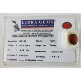 REPORT NO . LH 131CLARITY . N/ACOLOUR . COCA COLASHAPE / CUT . OVALWT . 4.35 CTSDIMENSION . 1-8.9-2.4-2.R . INDEX . 1.92-2.02HARDNESS . 6.5-7.5COMMENT . HESSONITE..