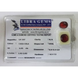 REPORT NO . LH 167CLARITY . N/ACOLOUR . COCA COLASHAPE / CUT . OVALWT . 4.05 CTSDIMENSION . 9-9.9-4.4-8.R . INDEX . 1.92-2.02HARDNESS . 6.5-7.5COMMENT . HESSONITE..