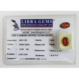 REPORT.NO.-LHS 178CLARITY.-N/ACOLOUR.-COCA COLASHAPE/CUT.-OVALWT.-3.10 CTSDIMENSION.-10-3.7-1.4-5.R.INDEX.-1.92-2.02HARDNESS.-6.5-7.5COMMENT.-HESSONITE { S }..