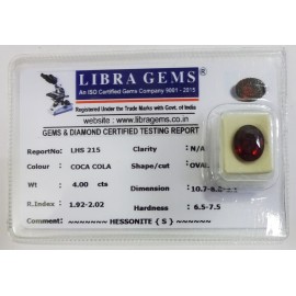 REPORT.NO.LHS 215CLARITY.N/ACOLOUR.COCA COLASHAPE/CUT.OVALWT.4.00 CTSDIMENSION.10.7-8.8-5.1R.INDEX.1.92-2.02HARDNESS.6.5-7.5COMMENT.HESSONITE {S}..