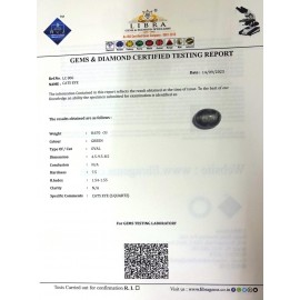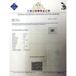 DATE:15-8-2024REF.NO:LCK 16NAME:CATS EYEWEIGHT:2.20 CTSCOLOUR:L.GREENTYPE OF/CUT:OVALDIMENSION:9.1-5.4-4.6CONCLUSION:N/AHARDNESS:7.5R.INDEX:1.54-1.55CLARITY:N/ASPECIFIC COMMENTS:CATS EYE {K}..