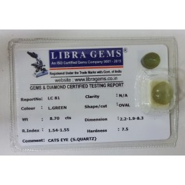 REPORT NO . LC 81CLARITY . N/ACOLOUR . L . GREENSHAPE / CUT . OVALWT . 8.70 CTSDIMENSION . 2-2.1-9.8-3.R . INDEX . 1.54-1.55HARDNESS . 7.5COMMENT . CATS EYE { S . QUARTZ }..