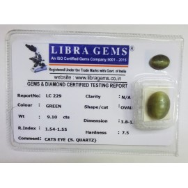 REPORT NO . LC 229CLARITY . N/ACOLOUR . GREENSHAPE / CUT . OVALWT . 9.10 CTSDIMENSION . 3-8.1-3.7-8.R . INDEX . 1.54-1.55HARDNESS . 7.5COMMENT . CATS EYE { S . QUARTZ }..