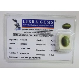 REPORT NO . LC 240CLARITY . N/ACOLOUR . GREENSHAPE / CUT . OVALWT . 6.87 CTSDIMENSION . 3-3.10-1.7-1.R . INDEX . 1.54-1.55HARDNESS . 7.5COMMENT . CATS EYE { S . QUARTZ }..