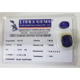 REPORT NO . LN 32CLARITY . N/ACOLOUR . BLUESHAPE / CUT . OVALWT . 8.52 CTSDIMENSION . 3-4.2-1.5-1.R . INDEX . 1.76-1.78HARDNESS . 9.0COMMENT . BLUE SAPPHIRE..