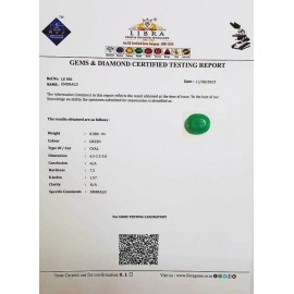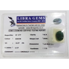 REPORT.NO.- LE 177CLARITY.- N/ACOLOUR.- GREENSHAPE/CUT.-OVALWT.- 4.27 CTSDIMENSION.- 1-9.8-3.6-1.R.INDEX.- 1.57HARDNESS.- 7.5COMMENT.- EMERALD..